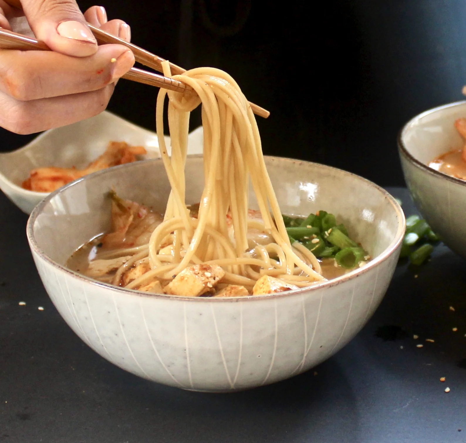 Spoon broth into bowl, top with noodles and tofu. Garnish with kimchi, green onion, and everything seasoning.